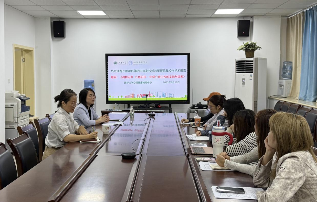 2025年9月18日上午08:30-10:30,成都市郫都区第四中学副校长、中小学高级教师、国家三级心理咨询师、成都市家长学校郫都区分校副校长、西华大学教育硕士专业学位心理健康教育领域研究生行业导师徐苹莅临西华大学心理健康教育中心504会议室,作“润物无声 心育花开--中学心育工作的实践与探索”的学术报告。报告会由心理健康教育中心副主任李鹤主持,西华大学教育硕士专业学位心理健康教育领域2025级研究生参加了报告会。