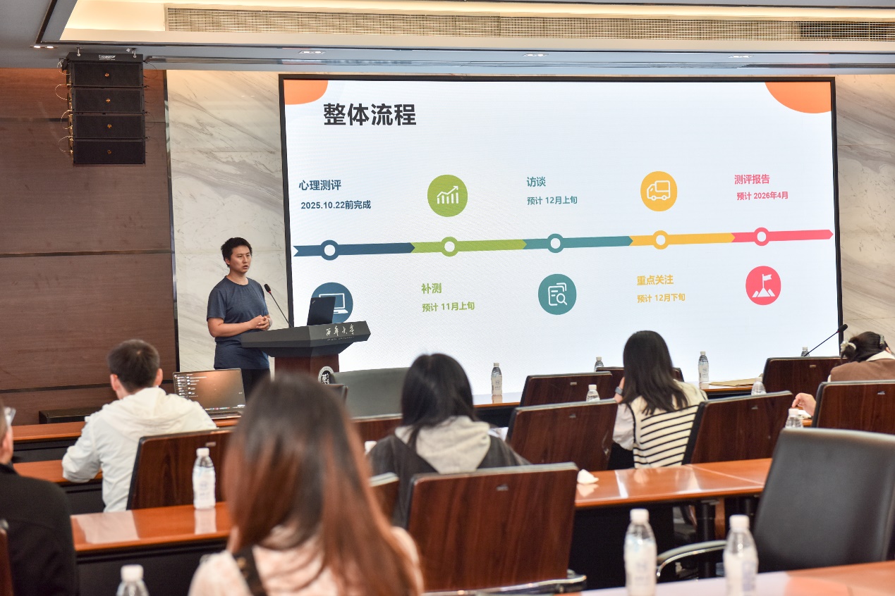 王中瑞老师作“2025年新生心理测评”培训,对测评工作整体流程进行详细介绍,包括测评、补测、访谈、重点关注和测评报告等,并对近期测评工作进行安排。
