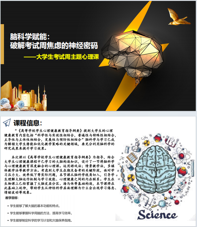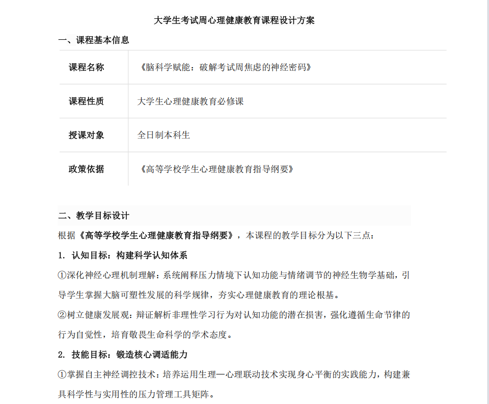 该课程以《高等学校学生心理健康教育指导纲要》为指导,构建了完整的教学目标体系,涵盖认知、技能、态度三个维度。课程内容科学准确,教学方法多样互动,评价体系完善创新,充分体现了心理健康教育课程的发展方向。特别是课程将复杂的脑科学知识转化为学生可体验、可操作的学习工具,如“神经生存包”、“脑节律计划本”等设计,让科学用脑的理念真正融入学生的日常学习生活,具有显著的实践价值和推广意义。
