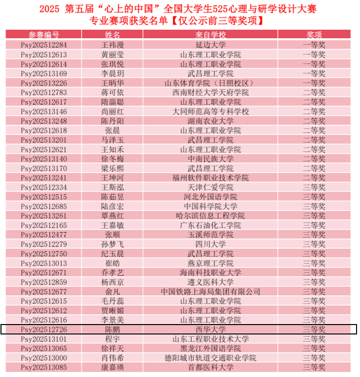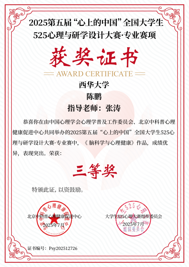 在刚刚结束的 2025年第五届“心上的中国”全国大学生525心理与研学设计大赛 中,我校 心理健康教育研究中心师生团队凭借原创课程作品《脑科学赋能:破解考试周焦虑的神经密码》,从全国众多高校参赛作品中脱颖而出,荣膺专业赛项(大学生心理成长研学课程设计大赛)全国三等奖!这是我校在心理健康教育课程创新与实践领域取得的又一重要突破!