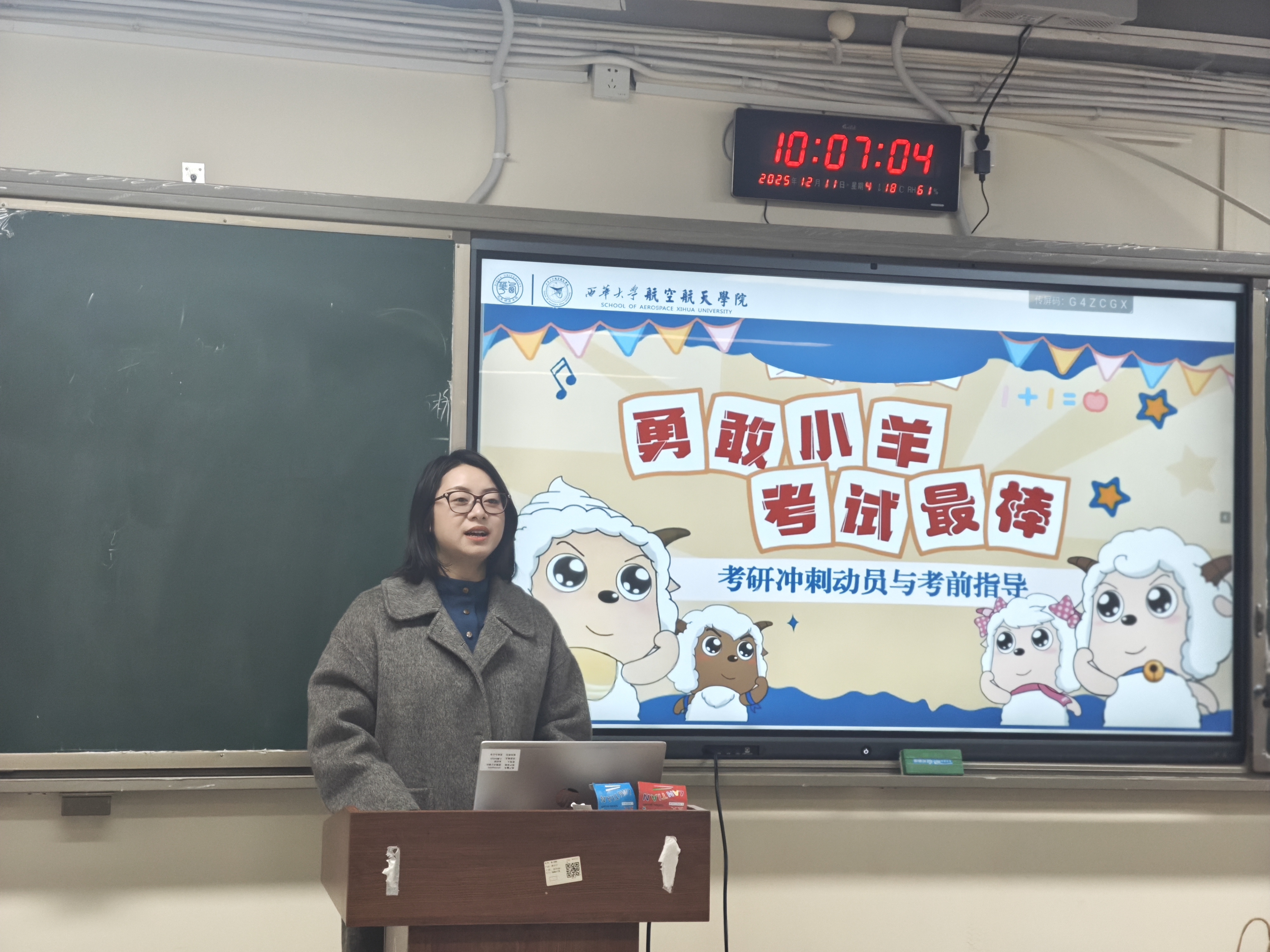随着2025年全国硕士研究生招生考试进入最后冲刺阶段,为帮助同学们坚定备考信心、科学规划复习、调整应考状态,航空航天与智能装备于12月11日上午10:00精心组织了考研冲刺动员与考前指导会。学院党委副书记余莎莎、辅导员黄佳与备战考研的学子们齐聚一堂,共同为最后的征程加油鼓劲。