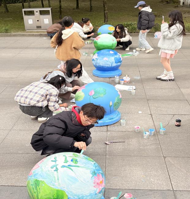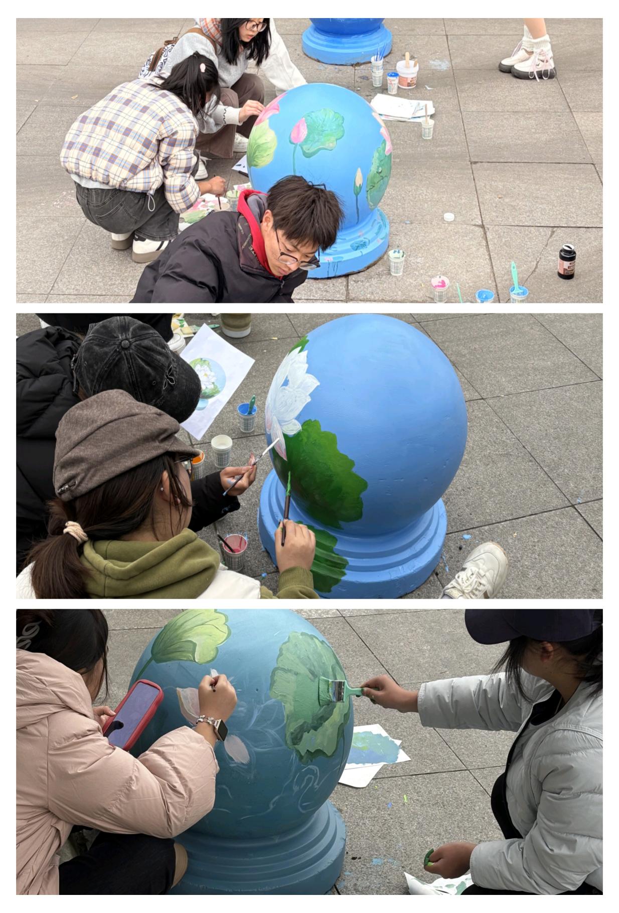 路过的师生纷纷驻足围观,设计专业的李同学一边细致勾勒莲蓬的纹路,一边笑着说:“平时在画室里画设计图,这次能在石墩上创作,把专业技能用在美化校园上,感觉特别有意义。看着光秃秃的石墩在自己手里变得这么漂亮,成就感满满!”现场不时传来阵阵笑声,画笔摩擦石墩的沙沙声、同学们的讨论声、路师生的赞叹声,交织一首动听的校园创意交响曲。