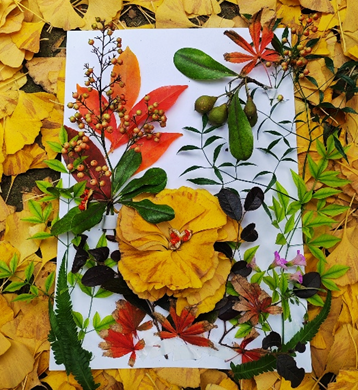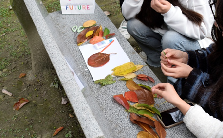 规则讲解完毕后,活动进入校园取材与自由创作阶段。各参赛队伍纷纷漫步于秋日校园,在落叶与树影间穿梭,兴致盎然地捡拾飘落的树叶、花瓣和形态各异的树枝作为创作素材。返回教室后,同学们充分发挥想象力与创造力,将收集到的自然素材拼贴成画,在协作与交流中完成了一幅幅独具匠心的艺术作品。