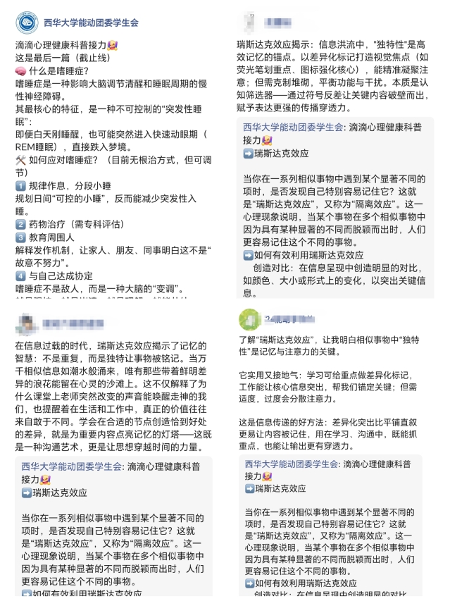 为积极响应全国大学生心理健康日号召,进一步加强学生心理健康教育工作,2025年10月21日至10月29日,西华大学能源与动力工程学院依托线上平台,成功举办了“能源心动力·科普接力行”心理健康知识接力活动。本次活动面向全校学生,累计吸引近800人次参与,旨在普及心理健康知识,提升学生心理调适能力,营造积极健康的校园文化氛围。