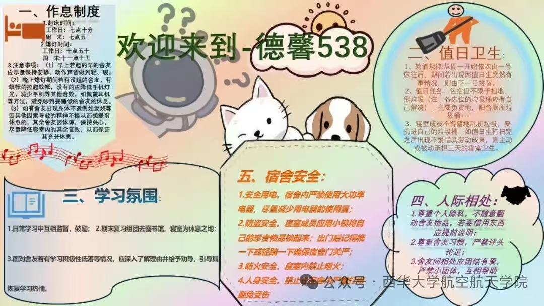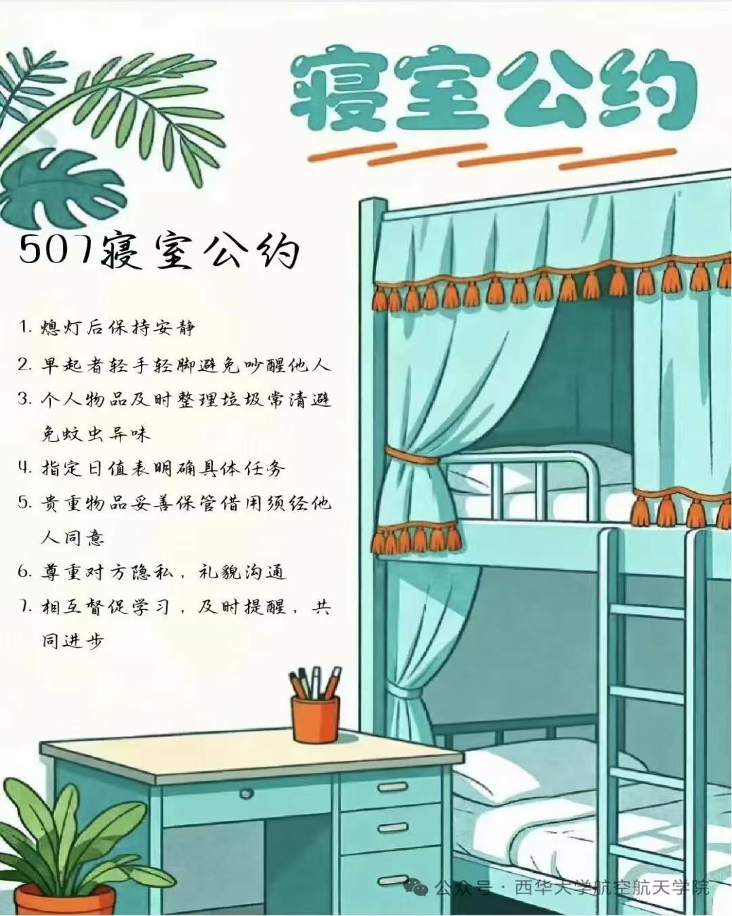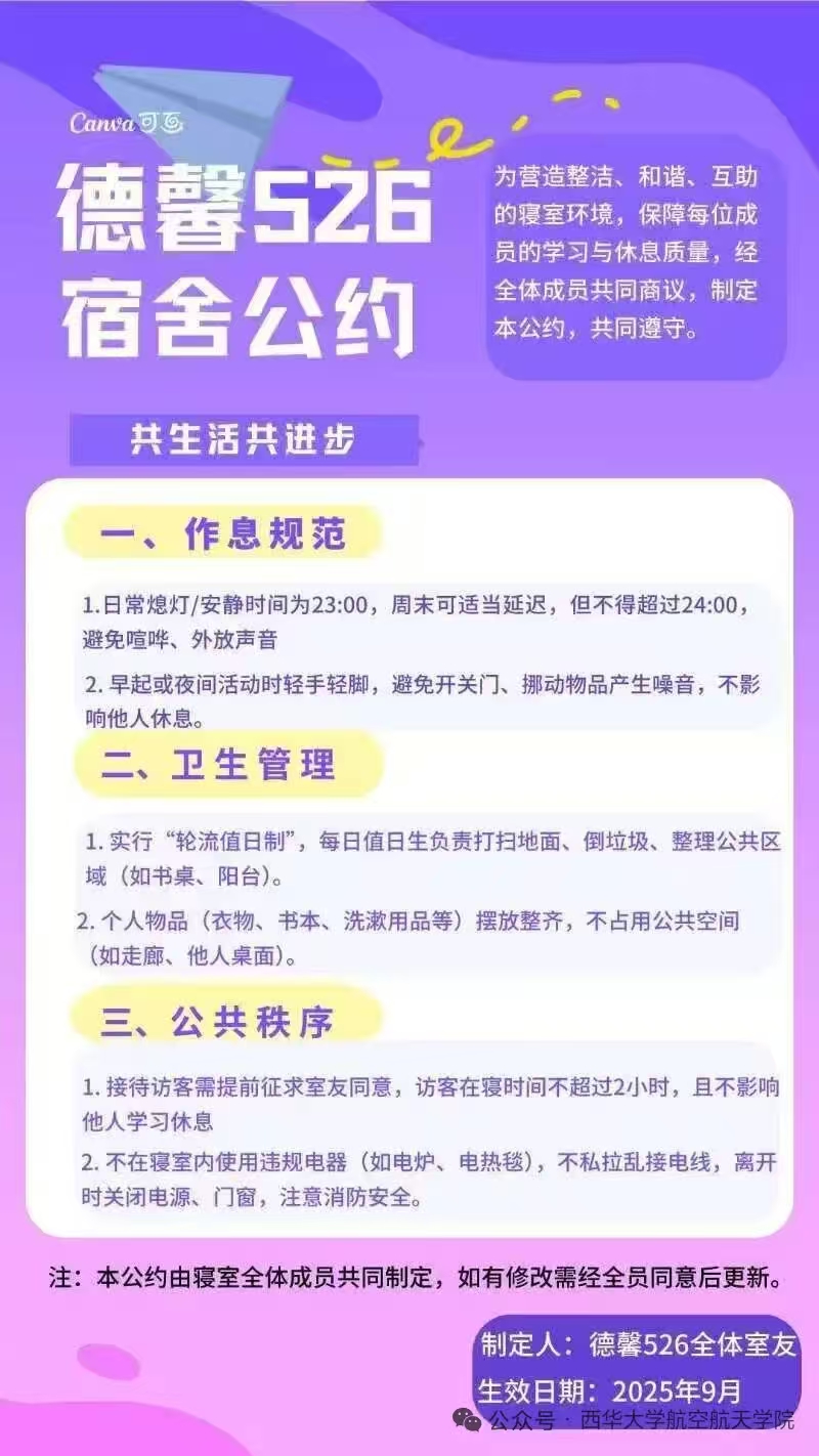 自活动启动以来,各新生宿舍热情高涨,同学们共同商讨、精心创作,提交了一大批内容丰富、形式新颖的公约作品。有的宿舍绘制了色彩斑斓、漫画风格的手绘海报,将公约条款融入生动有趣的故事情境;有的宿舍发挥巧思,录制了幽默风趣的短视频;还有的宿舍设计了精美的电子长图、创作了朗朗上口的“多行公约诗”,充分展现了新生的创造力与协作精神。这些公约内容涵盖了作息时间、内务卫生、学习氛围、安全用电等方方面面,不仅是一纸规章,更是室友间共同的青春约定与对美好生活的向往。