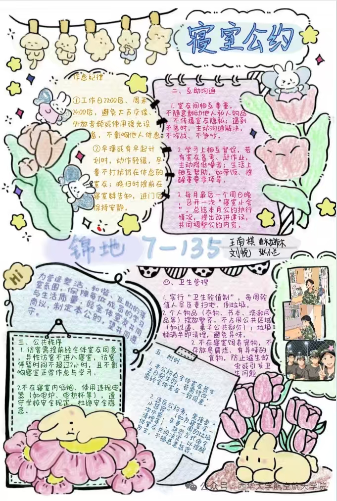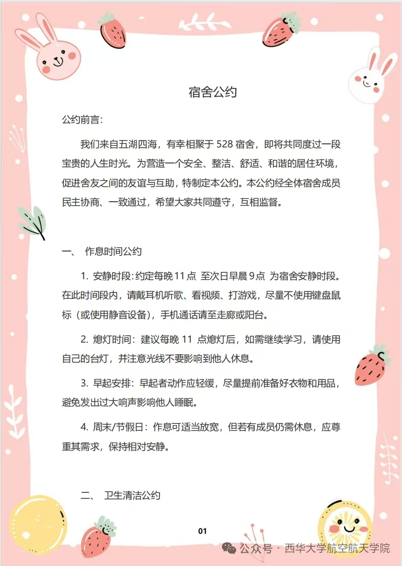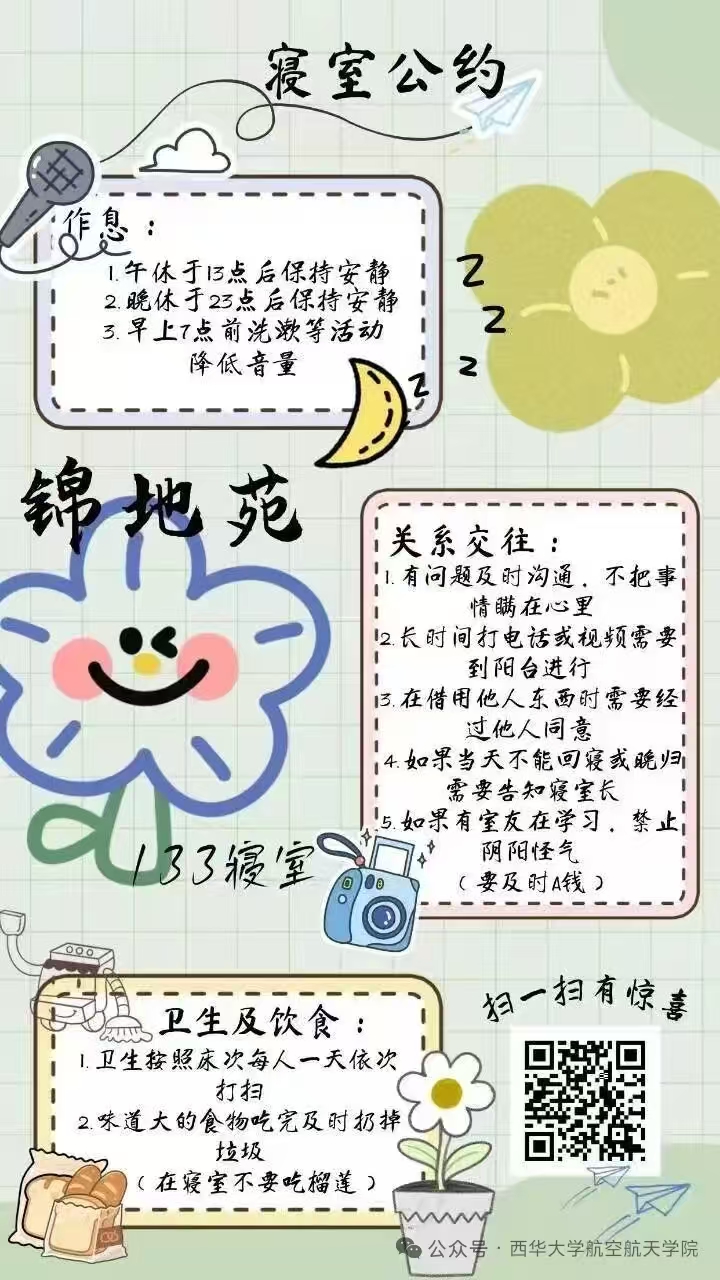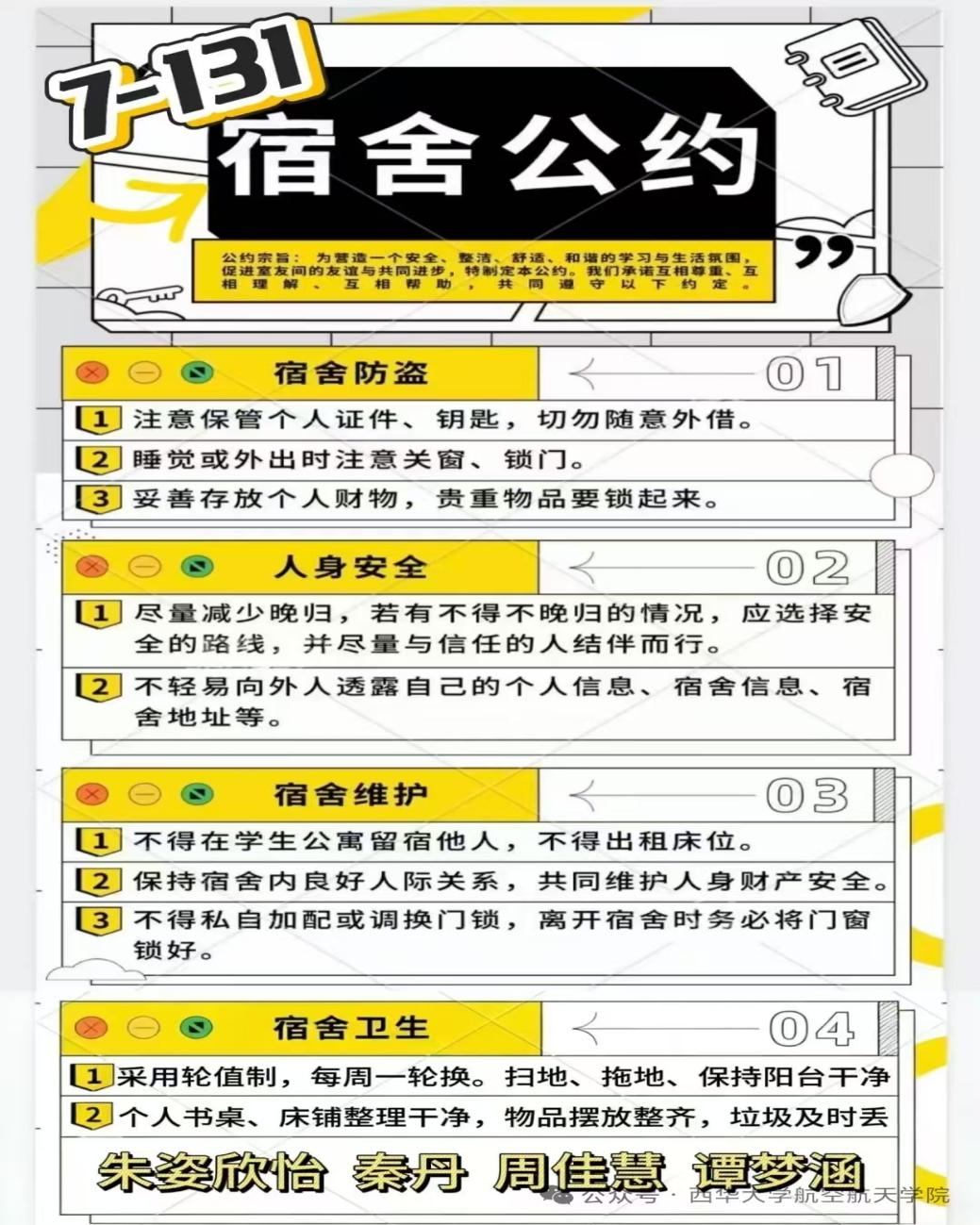 自活动启动以来,各新生宿舍热情高涨,同学们共同商讨、精心创作,提交了一大批内容丰富、形式新颖的公约作品。有的宿舍绘制了色彩斑斓、漫画风格的手绘海报,将公约条款融入生动有趣的故事情境;有的宿舍发挥巧思,录制了幽默风趣的短视频;还有的宿舍设计了精美的电子长图、创作了朗朗上口的“多行公约诗”,充分展现了新生的创造力与协作精神。这些公约内容涵盖了作息时间、内务卫生、学习氛围、安全用电等方方面面,不仅是一纸规章,更是室友间共同的青春约定与对美好生活的向往。