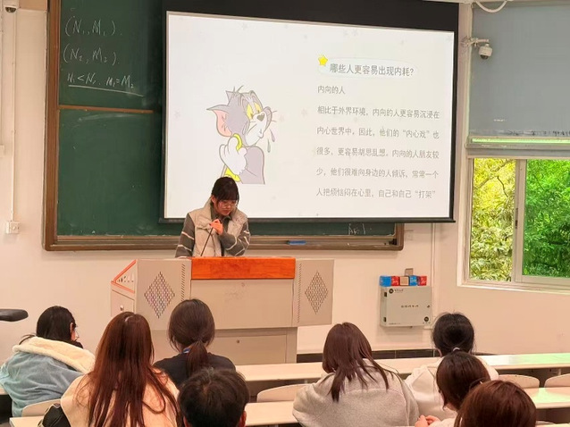 班会伊始,主持人通过具体表现切入,让同学们直观认识自我内耗—— 计划拖延、选择犹豫、自我责备、过度思虑等,引发了大家的强烈共鸣。随后,主持人分析了易陷入内耗的人群特征,指出讨好型人格、内向者及高敏感人格因性格特质更易出现内心纠结、自我消耗的情况。