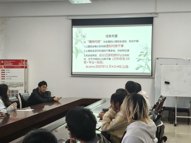 11月10日中午,理学院心社联组织24级全体心理委员召开了以“精神内耗”为主题的培训会。本次活动通过理论讲解、互动游戏与实践任务相结合的形式,为心理委员开展班级心理班会提供了清晰指引。